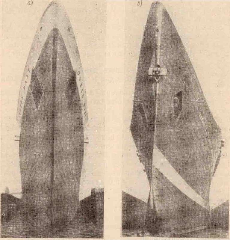 Реализацией принципа «погашения» является увеличение волнообразующей длины. Одним из средств этого служит применение крейсерской кормы и бульбовых образований носа. Положительный эффект формы носовых образований с каплеобразным утолщением был впервые установлен экспериментально В. Фрудом еще в 70-х годах прошлого столетия, а в 1909 г. — адмиралом Тейлором, директором Вашингтонского зпытового бассейна и главным конструктором ВМФ США на основе опыта постройки и испытаний броненосцев с утолщенным тараном. В 1923 г. Тейлор и Брагг обследовали эту форму носовых обводов путем систематических модельных испытаний и показали, что уменьшение волнового сопротивления зависит от размеров бульба. Видоизменением обводов Тейлора являются обводы, предложенные русским инженером В. И. Юркевичем, главным конструктором французского лайнера «Нормандия». Еще в бытность конструктором на Северной верфи б. Путилов- ского завода и строителем первых линейных крейсеров русского флота типа «Измаил» он заложил в эти корабли основы обводов, которые впоследствии были применены при постройке «Нормандии».