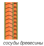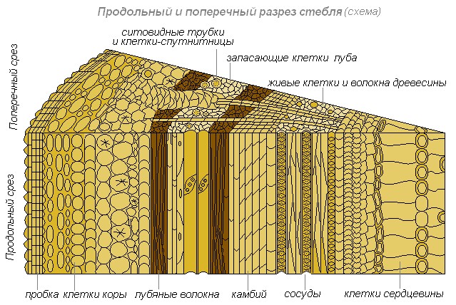 Плотный, самый широкий слой – древесина – основная часть стебля. Как и луб, состоит из разных клеток разной формы и величины: сосудами проводящей ткани, древесинными волокнами механической ткани и клетками основной ткани.