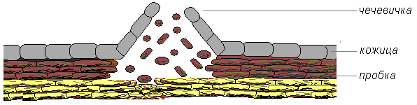 В пробке развиваются чечевички – маленькие бугорки с отверстиями. Чечевички образованы крупными клетками основной ткани с большими межклетниками.