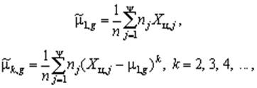 Для характеристики эмпирического распределения можно использовать оценки центральных и начальных моментов. Применение находят моменты до четвертого порядка включительно, так как точность выборочных моментов резко падает с увеличением их порядка, в частности, дисперсия начальных моментов порядка r зависит от моментов порядка 2r. Она становится значительной для моментов высокого порядка даже при больших объемах выборки. Выборочные значения моментов определяют непосредственно по выборке или по сгруппированным данным [3, 5, 9].