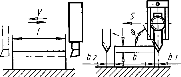 l - длина заготовки, мм; b2 - перебег резца, мм; b - ширина заготовки, мм; b1 - врезание резца, мм; t - глубина резания, мм