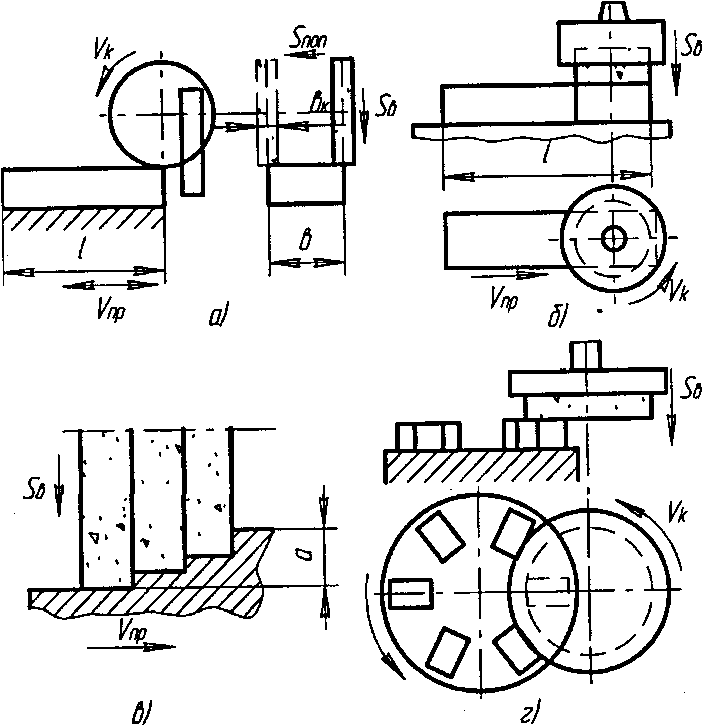 При первом способе (рис. 96, а) поперечное движение подачи круга производится после каждого продольного хода стола, а вертикальное - после рабочего хода по всей поверхности длины деталей (l ).