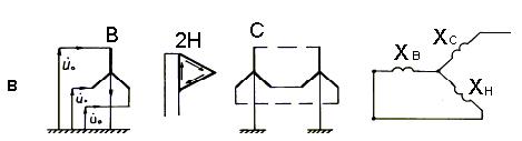 На рис.11.2,в ток нулевой последовательности протекает по всем обмоткам трансформатора Х0 = ХВ + ХН·ХС / (ХН + ХС).