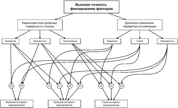 Точность фиксирования факторов определяется точностью приборов и стабильностью уровня в ходе опыта. Для упрощения схемы принятия решений мы введем приближенную классификацию, полагая, что есть низкая, средняя и высокая точности. Можно, например, считать, что поддержание температуры в реакторе с погрешностью не более 1% соответствует высокой, не более 5% – средней, а более 10% – низкой точности.