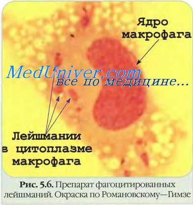 Лейшманий легче обнаружить в соскобах из нераспавшихся узелков кожи, особенно в области ушей и внутреннего угла глаз. При наличии язв материал берут из зоны краевого инфильтрата или из грануляций, раздавливая последние между двумя предметными стеклами. Вместе с соскобом стремятся получить серозную жидкость, по возможности избегая кровотечений. Капли серозной жидкости переносят на предметные стекла и готовят тонкие мазки, фиксируя их метиловым спиртом и окрашивая по Романовскому. Под микроскопом отыскивают участки с большим числом ретикулоэндотелиальных клеток (гистиоциты, макрофаги, моноциты и др.), в протоплазме которых и находят лейшманий. При исследовании используют большие увеличения и компенсаторные окуляры.