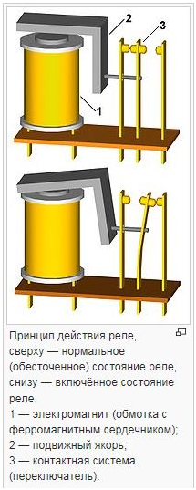 На представленном ниже рис. 1 представлен упрощенный вид конструкции реле постоянного тока. Оно состоит из сердечника с намотанной на него катушкой, при протекании по которой постоянного тока создается магнитный поток, который замыкается через якорь. При подаче напряжения на выводы катушки, она втягивает в себя сердечник по принципу электромагнита, при этом толкатель двигает (толкает) подвижную систему контактов, часть из которых при этом замыкается, а часть размыкается. Катушка воспринимает входной сигнал в виде тока или напряжения. Якорь является промежуточным звеном, который передает воздействие от воспринимающего органа к исполнительному. Последний представляет собой контактную систему, состоящую из группы контактов, одни из которых размыкают электрическую цепь (аналог сигнала 0), а другая замыкает (аналог сигнала 1).
