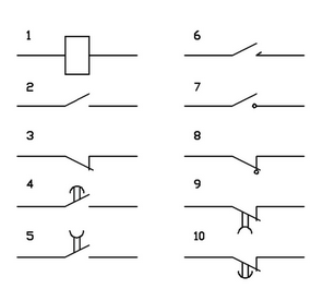 На схемах ДУ для реле приняты обозначения, которые представлены на приведенном ниже рис. 2. На этом рисунке цифрами обозначены: 1- обмотка реле, 2- контакт замыкающий, 3- контакт размыкающий, 4- контакт замыкающий с замедлителем при срабатывании, 5- контакт замыкающий с замедлителем при возврате, 6 – контакт импульсный замыкающий, 7- контакт замыкающий без самовозврата, 8- контакт размыкающий без самовозврата, 9- контакт размыкающий с замедлением при срабатывании, 10 - контакт размыкающий с замедлением при возврате.