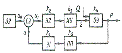 Если среднее значение припуска равно z0 и назначен режим обработки с постоянной подачей S0, номинальная сила резания равна Р0. При разомкнутой системе для обеспечения необходимой подачи на входе усилителя У2действует напряжение u1, а подача S0 = k2k3u1, где k2, k3 – соответственно передаточные коэффициенты усилителя У2 и исполнительного устройства ИУ. Так как текущее значение припуска может отличаться от номинального на величину Δz, то фактическое значение z = z0± Δz. В результате фактическая сила резания Р' = kS0 (z0± Δz) отличается от номинальной P0= kS0z0 и отклонение силы резания от заданного значения составляет ±P' = kS0Δz.